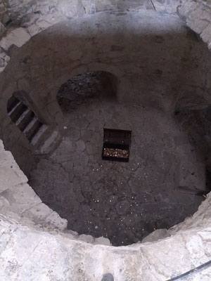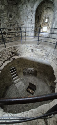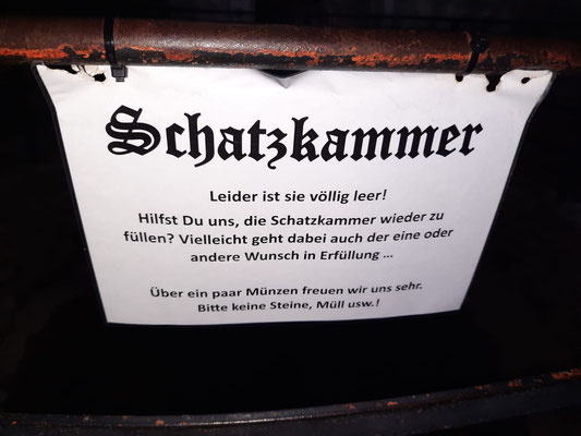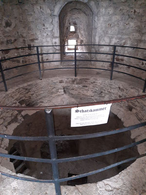Wir können ungehindert den Turm erklettern, durch einen schmalen holprigen dunklen Gang. Oben ist ähnlich viel Aussicht rundum, nur ein paar Meter höher. Im Turm geht es noch in einen anderen Gang, der in einem runden, mit Geländer gesicherten Bereich endet. Dort steht "Schatzkammer" auf einem Zettel und ein paar Meter weiter unten eine offene Holztruhe, in und neben der zahlreiche Münzen blinken. Pah, Schatzkammer ! Das ist bestimmt Peters neue Masche, die Clubkasse aufzubessern. Scheint sogar zu funktionieren...