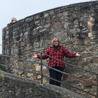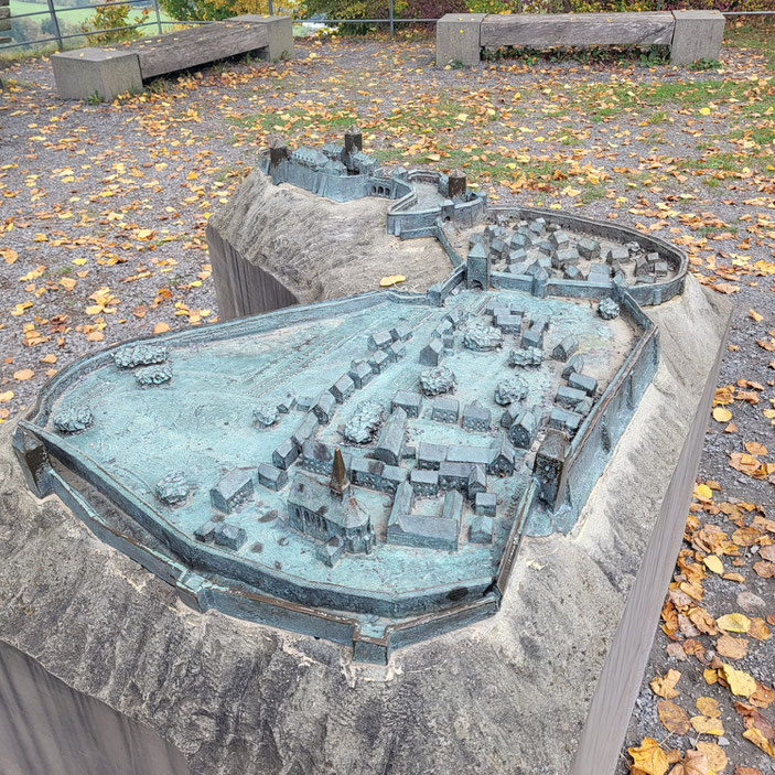 Wie Peter allerdings die Schatzkiste wieder einkassiert bekommen wir nicht mit. Er lenkt uns geschickt vom Parkplatz wieder weg, wir rollen auf einen anderen Parkplatz und laufen durch das Katharinentor (gehört noch alles zum Burggelände) in ein gut erhaltenes Fachwerkdorf. Außer Fachwerkhäuschen gibt es hier recht wenig - das Restaurant steht zum Verkauf und alles andere ist einfach zu. Aber pittoresk. Nun denn, zurück - Katharina guckt ungerührt von ihrem Turm herunter auf uns - und lässt den ganzen Rollertrupp wieder bergab fahren.