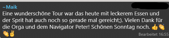 Aus ist! Letzte Tour für dieses Jahr. Letzte "offizielle" Sonntagstour jedenfalls. Das muß bei uns nicht viel bedeuten, es gibt hier immer ein paar Hartgesottene, die auch bei unterkühlten Temperaturen die Reifen warmrollern. Die funken dann auf der "WhatsApp Info Gruppe"-Frequenz durch, wer spontan wohin will - und dann mal sehen, was läuft...