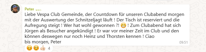 Das war ein ausgesprochen lustiger Clubabend, der sicher noch wie die Schnitzeljagd eine Weile lang nachwirken wird.